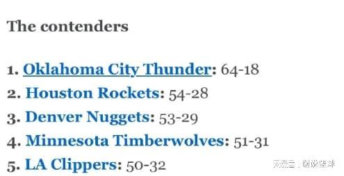 而媒体ESPN就预测了西部争冠队排名,火箭仅次于卫冕冠军雷霆,排名榜单第二位。之后是掘金和森林狼,洛杉矶双雄快船和湖人无缘前四,当然ESPN只列出六队,其他都没有被提及。
